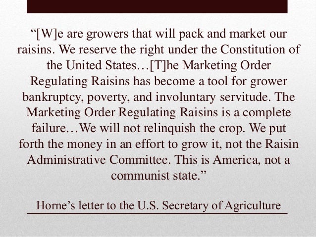 Una de las herramientas típicas utilizadas para paliar los efectos de la Gran Depresión fue el inflado artificial de precios mediantes el establecimiento de agencias que restringen la oferta de bienes de acuerdo con una determinación periódica de la oferta y la demanda esperables. En ese espíritu, la «Agricultural Marketing Agreement Act» de 1937 otorgó al Secretario de Agricultura la facultad de establecer y mantener las condiciones de un mercado ordenado para las commodities agrícolas. En el caso, se dictó la «Marketing Order» destinada a regular el mercado de las pasas producidas con uvas cultivadas en California. Esta directiva creó el Comité Administrativo de las Pasas (suena gracioso, pero no es tan original, recuérdese la Junta Nacional de Granos, la ídem de Carnes, etc.). El Comité se integra mayormente por representantes de los productores, pero también de otros sectores vinculados, designados por el Secretario. La «Marketing Order» establece un esquema que, muy sintéticamente, funciona de la siguiente manera: una parte de la producción de pasas puede ser vendido libremente por los productores o distribuidores (tonelaje libre), mientras que otra porción debe ser transferida en propiedad al Comité, para que este decida su destino de acuerdo a su criterio (tonelaje de reserva). Parte de estas pasas son donadas a obras de caridad, otra parte es destinada a programas de comedores escolares, otra es vendida en el exterior o en mercados no competitivos, entre otros destinos. Con su producido, el Comité realiza actividades de promoción de la industria, en particular en materia de exportaciones del producto, y subsidia la exportación de pasas. Si queda un remanente, lo distribuye entre los empacadores. Cada año, el Comité fija el porcentaje de la producción que debe ser reservado, empacado en bins especiales y puesto a su disposición. La finalidad del esquema es beneficiar a productores y distribuidores garantizando un precio interanual parejo y un mercado predecible. Supuestamente, también intenta beneficiar -por esas mismas razones- a los consumidores.